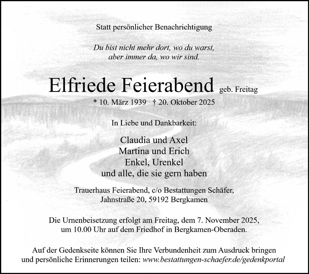 Liebe Claudia Martina und Angehörige, nach kurzer Zeit ist jetzt eure Mutter Schwiegermutter und Oma ihrem Klaus gefolgt,jetzt sind die beiden wieder Vereint. Ich wohne ja schon 15 Jahre in Bayern und man hat sich leider aus den Augen verloren. Ich denke oft an die schöne Zeit Brandenburger Straße zurück und auch oft wie wir mit Elfriede und Klaus zusammen waren,so werde ich beide auch in meiner Erinnerung behalten. Vielleicht treffen sie meinen Franz der am 17.12.2014 gestorben ist.