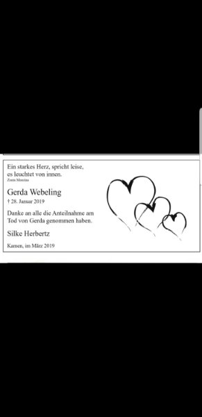 Frau Gerda Webelinggestorben am 28. Januar 2019