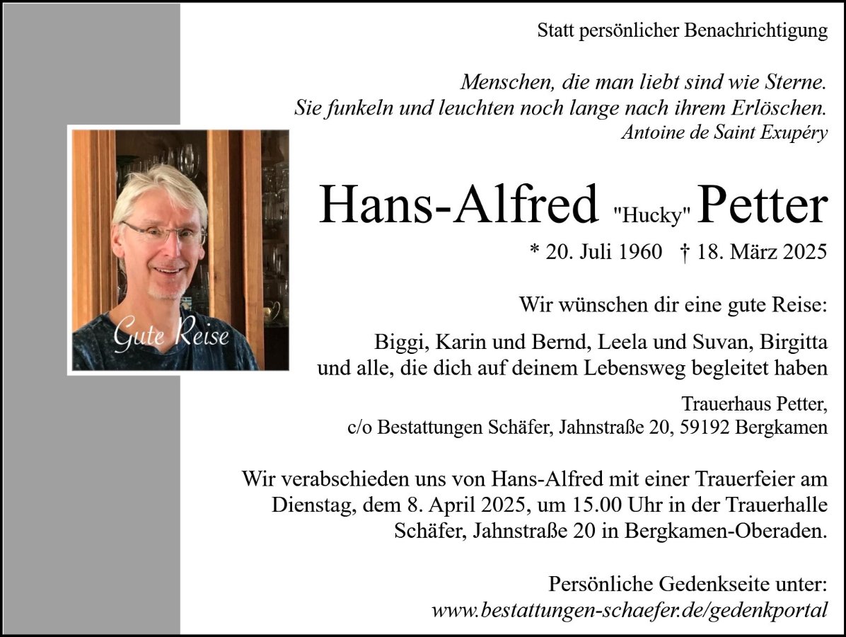 Du fehlst. Ein flotter Spruch im Vorbeigehen, ein kurzes Pläuschen in der Einfahrt, ein morgendlicher Gruß vom Balkon zur Terasse. Ich werde unsere langen Gespräche über Dein bewegtes Leben nicht vergessen. Deine fachkundigen Geschichten über die spannende Arbeit unter Tage haben mich jedes Mal gefesselt. Bei einer Flasche Bier am Gartenzaun nach der Gartenarbeit haben wir oft gelacht. Dabei war mir Dein intelligenter Humor immer wieder eine Freude. Diskussionen über Politik, Geschichte oder Musik konnten wir stets führen, denn Du warst immer tief in der Materie. Deine Hilfsbereitschaft war beispielhaft. Du fehlst mir als Nachbar und Freund und unsere letzten Begegnungen haben mich tief berührt. Ich wünsche mir für Dich, dass Du nun an einem besseren Ort bist. Frei von Sorgen und wir uns an diesem Ort irgendwann wiedersehen werden - am Gartenzaun. Mach es gut - Glück auf!