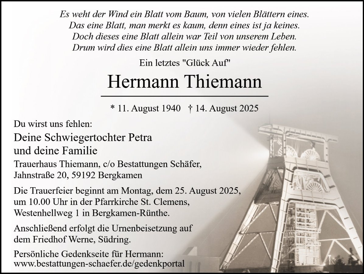 Herr Hermann Thiemanngestorben am 14. August 2025