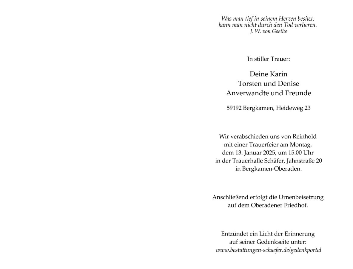 Liebe Karin, deine Benachrichtigung hat uns sehr mitgenommen. Gern hätte ich mich mit Reinhold nochmals ausgetauscht. Ich vermisste seinen Sylvesteranruf, was schon bei uns Tradition hatte. Ich vermisse jetzt schon seine Menschlichkeit und seinen Humor.
