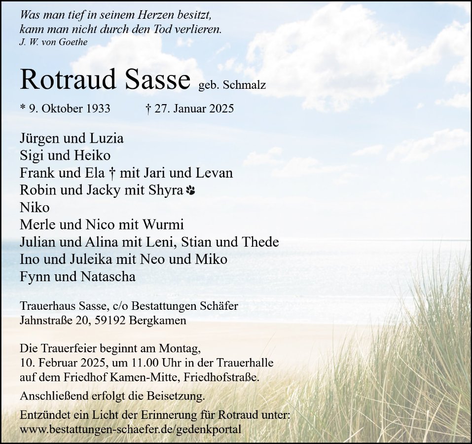 Wir wünschen euch allen viel Kraft und schöne Gedanken an eure Mutter, Schwiegermutter und Oma.