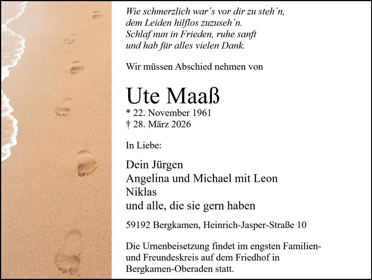 ich möchte hiermit Dir und deiner Familie, mein aufrichtiges Beileid zum Verlust deiner Frau , eurer Mutter und meiner Freundin Ute zum Ausdruck bringen.