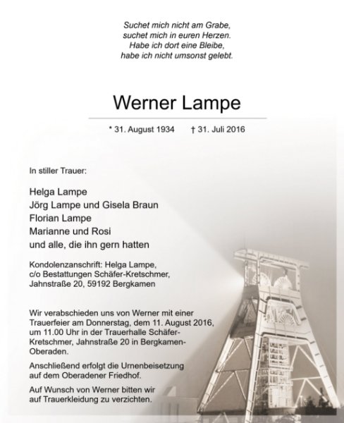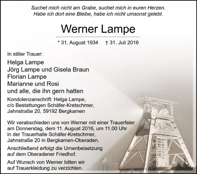 mein Papa, jetzt bist Du schon neun Jahre nicht mehr auf dieser Welt und trotzdem spüre ich Dich fast jeden Tag. Du sendest mir Zeichen, wenn ich Dich an Deiner letzten Ruhestätte besuche und Dich um Rat Frage - wie früher, als Du mich auf meinem Lebensweg begleitet hast. Ich werde Dich nie vergessen - mein Papa!